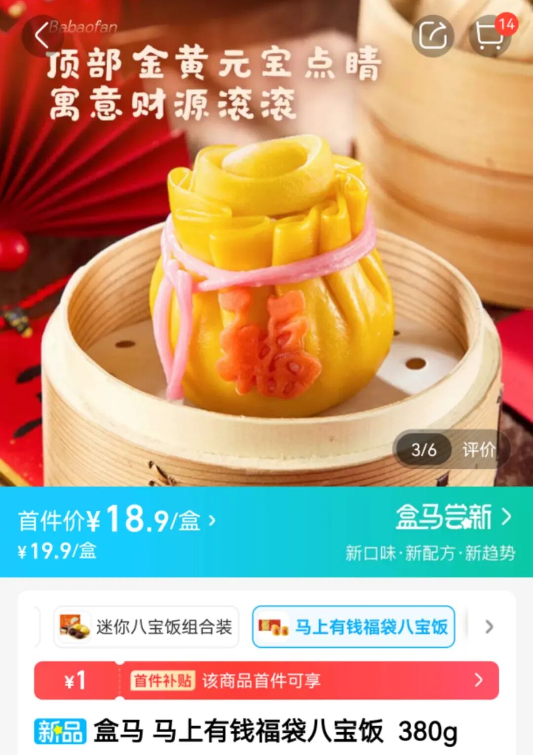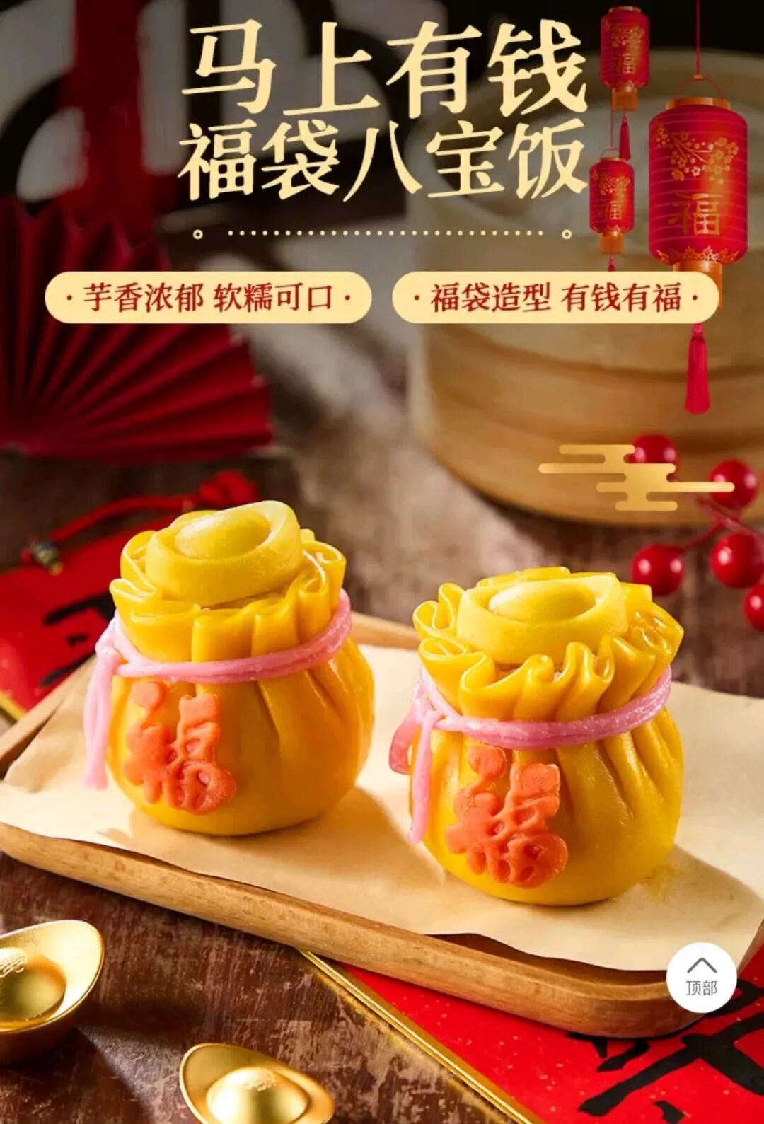 这个造型真的让人眼前一亮!外面是金黄色的福袋头上顶着金元宝里面居然是八宝饭?!这个idea有点意思~