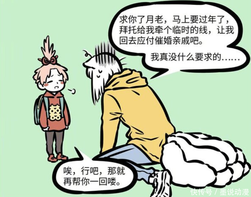 离过年那时越来越近,九月也想要脱单,她拜托月老牵红线,牵个临时红线也好。九月这么做,就是想回去的时候刚好应对催婚,不用被家人逼得那么急。九月还表示自己没什么要求,所以希望月老帮忙。实在拗不过九月,月老只能一边叹气,一边答应。